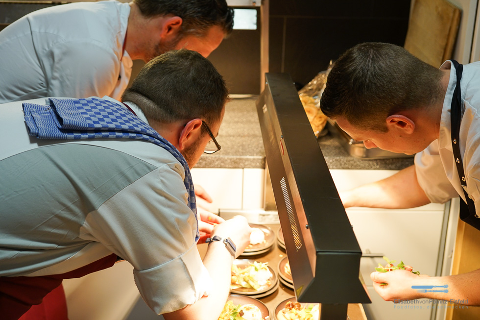 Es war ein ausgesprochen schöner Abend mit feinem Essen, gutem Wein und netten Menschen. Einfach mal wegfahren und es sich gut gehen lassen. Ich habe es sehr genossen. Danke an Daniel Kuhlmey und Frank Hörl für die überaus großzügige Einladung! Vor allem für die Zeit, die Du Dir, Daniel, am nächsten Tag für uns genommen hast. Es hat schon was, während des laufenden Betriebs hinter die Kulissen einer so großen Küchen schauen zu dürfen. Wie ein präzises Uhrwerk laufen die Prozesse dort ab. Jeder weiß genau was wann, wie und wo zu tun ist…und kein lautes Wort. Eine überaus fröhliche Küche bot sich mir.
