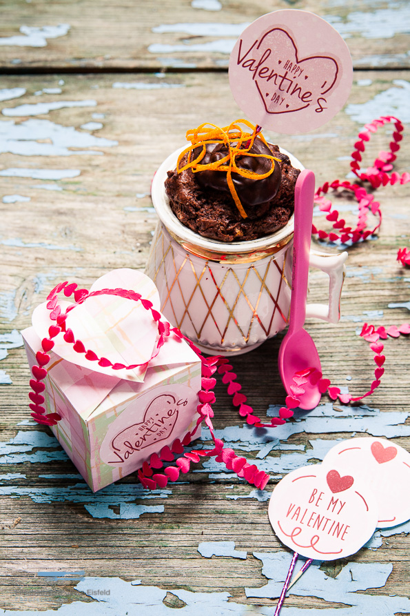 Ich habe mir für meine beiden Schätze super-schokoladige Orangen-Muffins ausgedacht, mit einer noch schokoladigeren Creme obendrauf! So ein kleines Muffin hat gut in die Schachtel gepasst. Die Creme habe ich vorher fest werden lassen, damit es nicht verschmiert in der Schachtel. Auf einem Zettel habe ich noch eine kleine Botschaft geschrieben und ihn unten in der Schachtel versteckt.