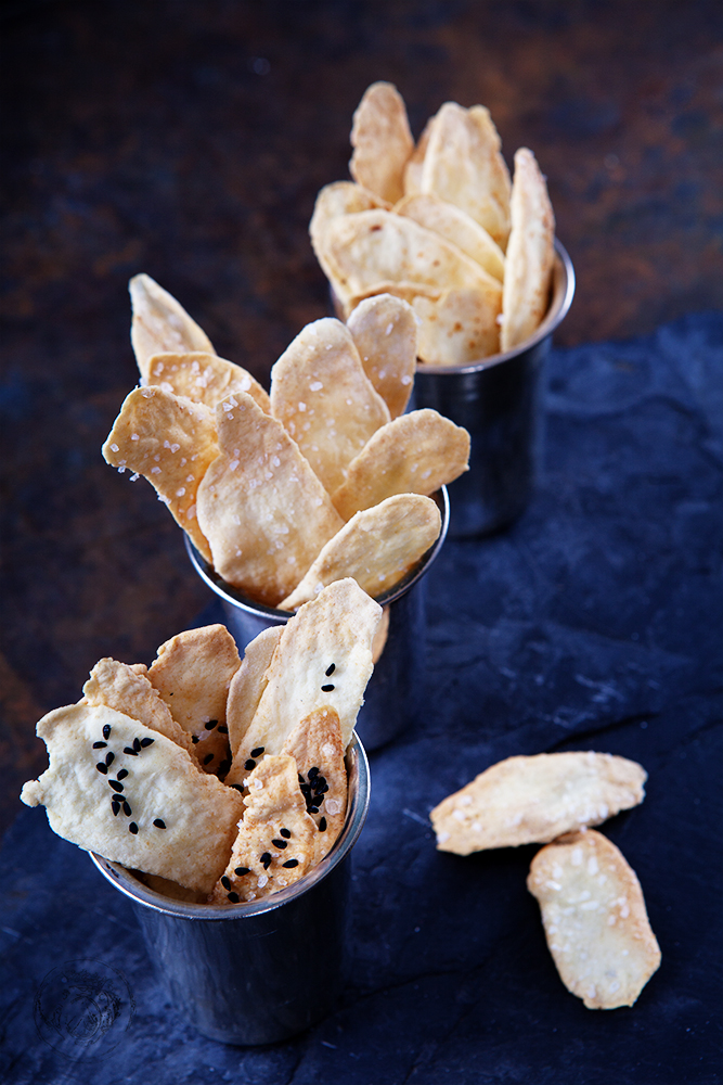Ofen auf 180 Grad vorheizen. Blech mit Backpapier auslegen. Vom Teig kleine Stücke abzupfen und so dünn wie möglich ca. 10 cm lang ausrollen. Mit Wasser bestreichen und mit Fleur de Sel oder Chili oder Sesam bestreuen. Im Ofen ca. 8—10 Minuten backen, bis sie leicht zu bräunen beginnen.