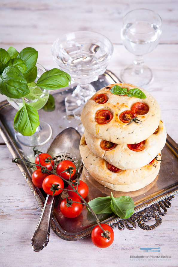 Die Cocktailtomaten halbieren. Den weichen Teig auf einer bemehlten Fläche kurz zusammenkneten (das kannst du auch in der Küchenmaschine machen) und in 5-6 Stücke teilen. Jedes Stück zu einer Kugel formen, auf das Backblech legen und flach drücken. Mit einer Gabel großzügig einstechen. Die halbierten Tomaten mit der Schnittfläche nach oben in den Teig drücken.