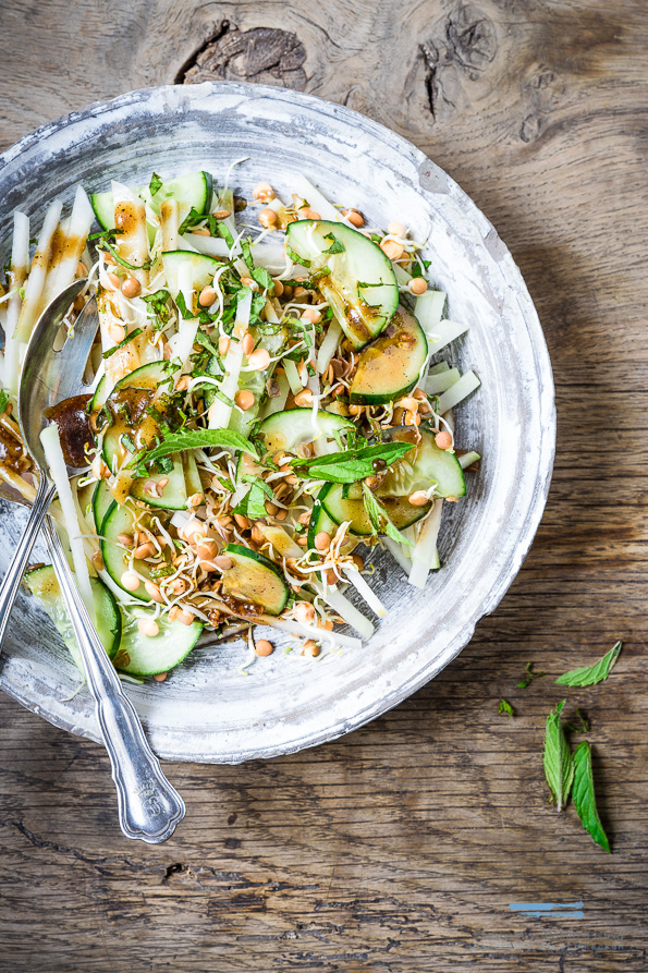 Wie ihr ja wisst, fotografiere ich fleißig Rezepte für Valentinas.Kochbuch in Berlin. Ich kann gar nicht alle Rezepte hier auf meinem Blog zeigen. Doch es gibt immer wieder welche , die mich total überzeugen! Ich habe bisher Kohlrabi entweder warm oder einfach nur aufgeschnitten gegessen. Diese Form aber, als Kohlrabisalat mit Sprossen und Gurke, ist einfach phänomenal. Dazu das Dressing und die Minze. WOW! Du findest das Originalrezept natürlich bei Valentinas (hast Du schon ein Abo bei Valentinas? Der Probemonat kostet nur 2,50€) und noch mehr aus dem Kochbuch: „Drei gute Dinge“ von Hugh Fearnley-Whittingstall oder etwas verändert gleich hier. (Werbung weil Verlinkung)