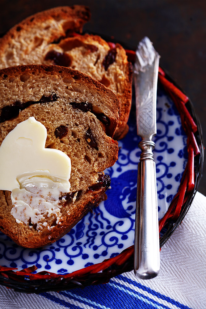 Danach nochmals durchkneten und zu einem Rechteck auswellen. Die Rosinen abtropfen lassen und auf der Teigplatte verteilen. Diese dann wie eine Bisquit-Roulade zusammenrollen und mit der Naht nach unten in die Kastenform legen. Zugedeckt nochmals 1 Std gehen lassen.